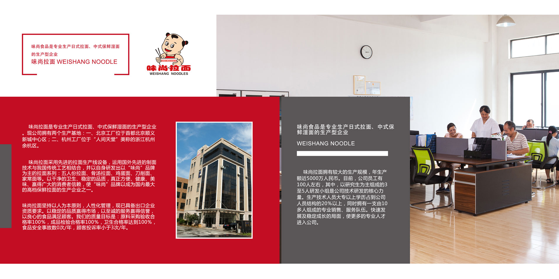 北京市味尚食品有限公司是一家專業生產日式拉面、中式保鮮生濕面的食品企業。公司成立于2009年6月,位于北京市順義區牛欄山開發區。公司引進全套日本自動生產線,并與我國傳統制面工藝相結合,研發出“味尚”品牌--家常面、雞蛋面、刀削面、長壽面、北方拉面、蘭州拉面、日式拉面、炸醬面等八大高端系列產品。